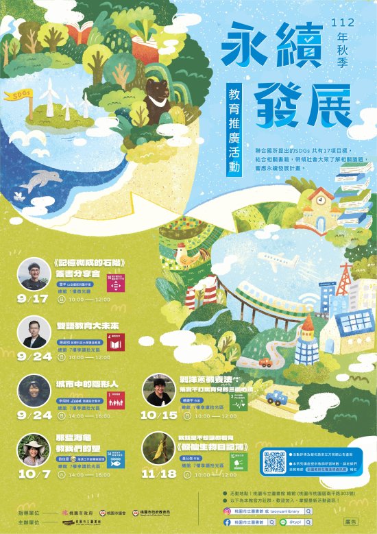 一、 | 今(112)年9月至11月開學期間辦理一系列講座,帶領學子們及社會大眾了解何為聯合國永續發展(SDGs)目標,教育民眾以自身出發,響應永續發展計畫,並搭配講者推薦書目,結合館藏推廣閱讀。 |