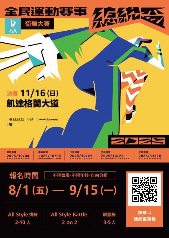 二、 | 該署為配合運動部掛牌成立,推展全民運動、競技運動全民化政策及擴大推廣街舞文化,首度舉辦「2025 總統盃全民運動賽事—街舞大賽」,並採全國性競賽形式,分為線上海選、四區實體複賽及總決賽三階段,共同角逐街舞最高榮譽。 |