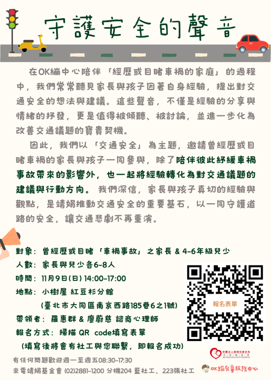 主旨: 函轉財團法人靖娟兒童安全文教基金會OK繃兒童服務中心辦理114年度「聽見安全的聲音-交通議題對話框」,請查照。