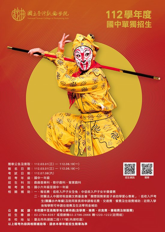 主旨: | 函轉國立臺灣戲曲學院112學年度國小與國中部單獨招生暨轉學單獨招生及高職部轉學單獨招生文宣,請貴校協助公告周知,請查照。 |