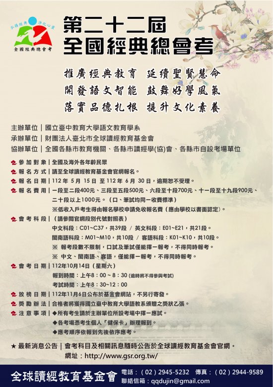 | 主旨: | 轉知財團法人臺北市全球讀經教育基金會辦理「第22屆全國經典總會考海報」,請協助公告轉知,請查照。 |