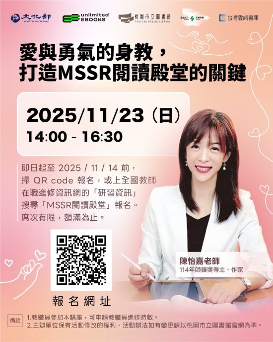 主旨: | 桃園市立圖書館與遠流出版事業股份有限公司於114年11月23日舉辦「愛與勇氣的身教,打造MSSR閱讀殿堂的關鍵」講座,請貴校惠予協助宣傳,請查照。 |