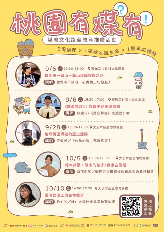 主旨: | 有關本局訂於114年9月至10月辦理「桃園有煤?有!-煤礦文化路徑教育推廣系列活動」,敬請踴躍報名參與並協助宣傳周知,請查照。 |