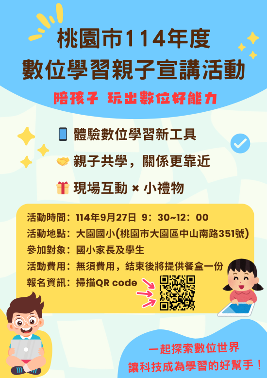 有關桃園市114年度「推動中小學數位學習精進方案」親子宣講暨種子教師培力計畫-大園國小場次,請貴校協助公告活動訊息及鼓勵家長踴躍參加,請查照。 |